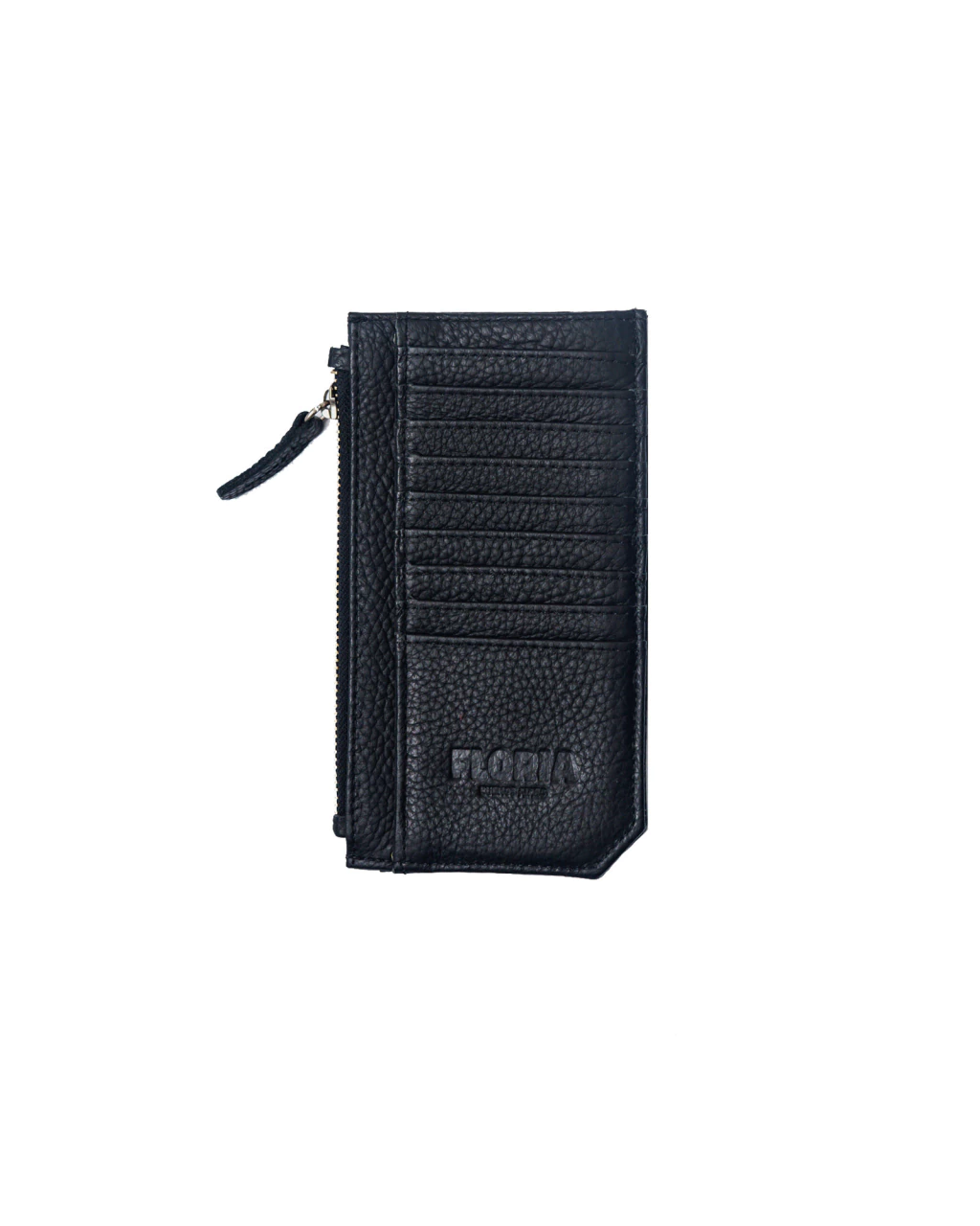 Tarjetero 100% cuero vacuno graneado. Espacio para varias tarjetas y un bolsillo con cierre para monedas o billetes.