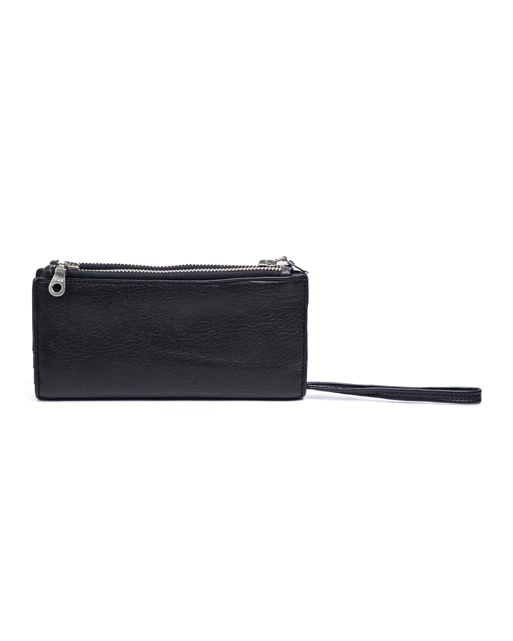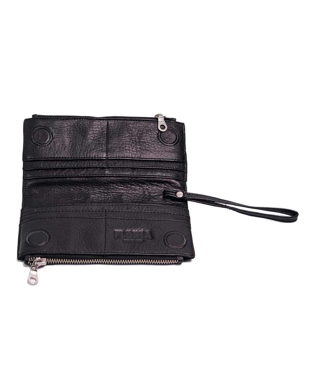 Billetera 100% cuero vacuno graneado. Espacio para varias tarjetas y doble bolsillo con cierre para monedas o billetes. Correa para la muñeca e iman super resistente.